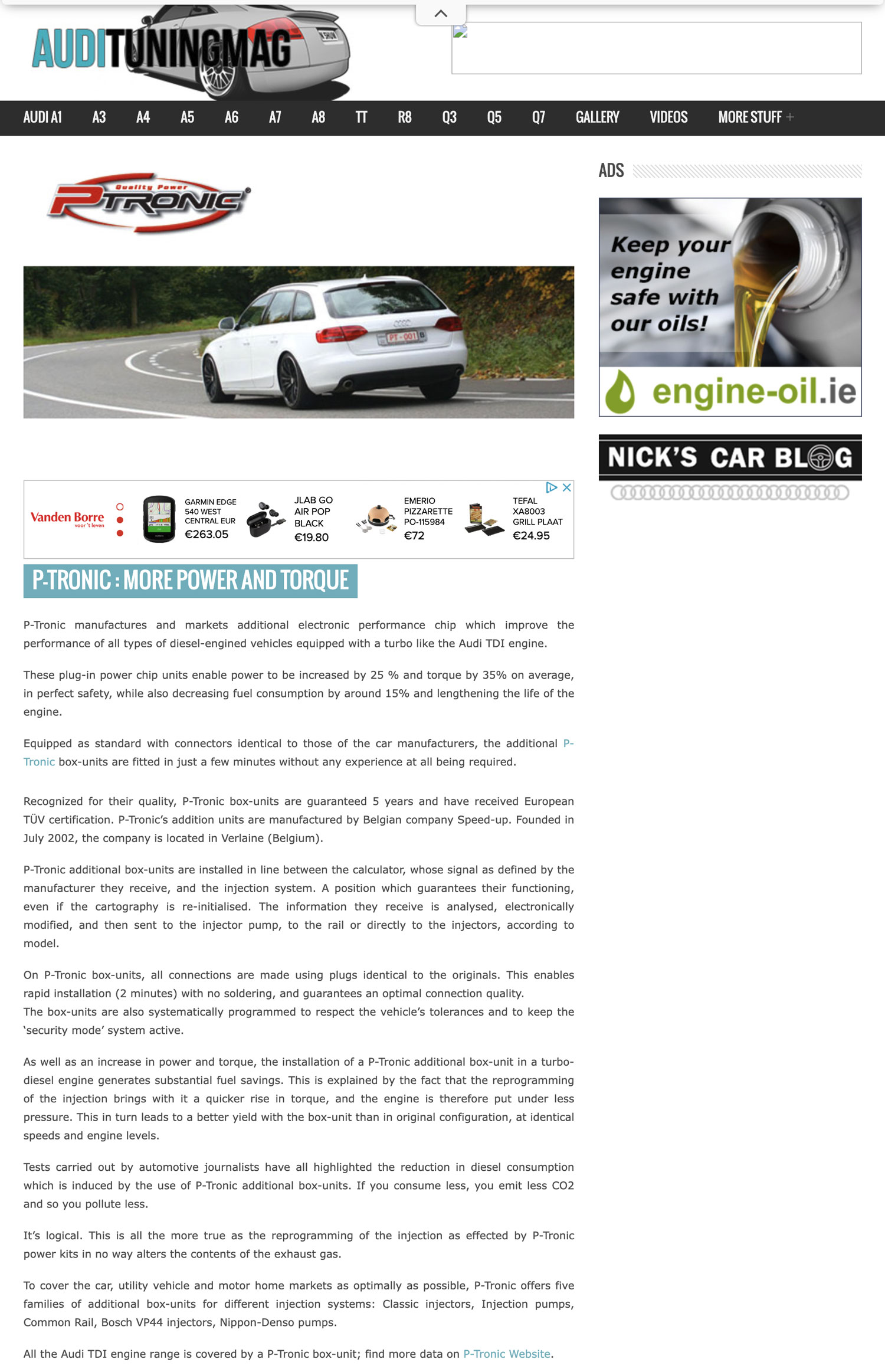 Het Britse gespecialiseerde magazine Audi presenteert P-Tronic als een oplossing aangepast aan alle TDI-motoren. Het artikel detailleert de gemiddelde winsten: +25% vermogen, +35% koppel, -15% verbruik, met verhoging van de levensduur van de motor.