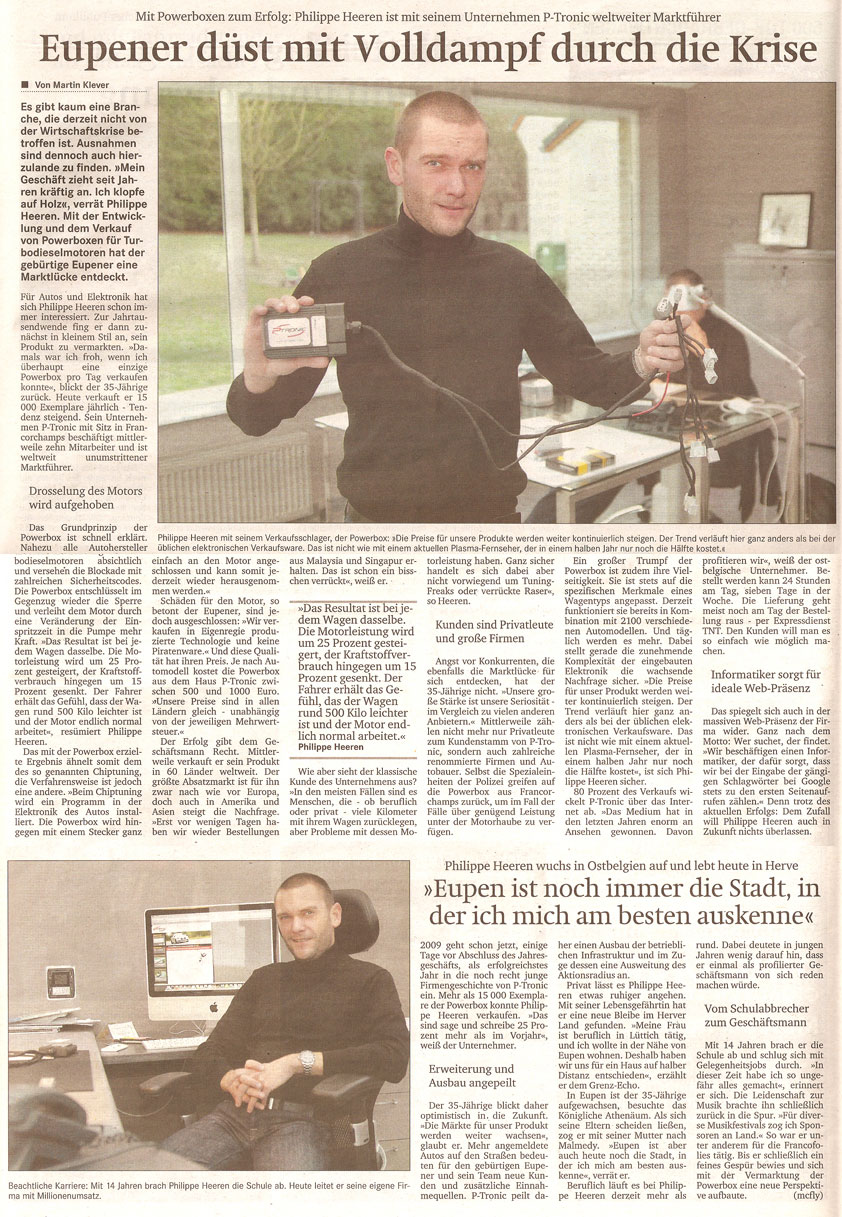 De Duitstalige krant GrenzEcho schetst het portret van Philippe Heeren, oprichter van P-Tronic, wiens bedrijf een uitzonderlijke groei kent midden in de economische crisis.
