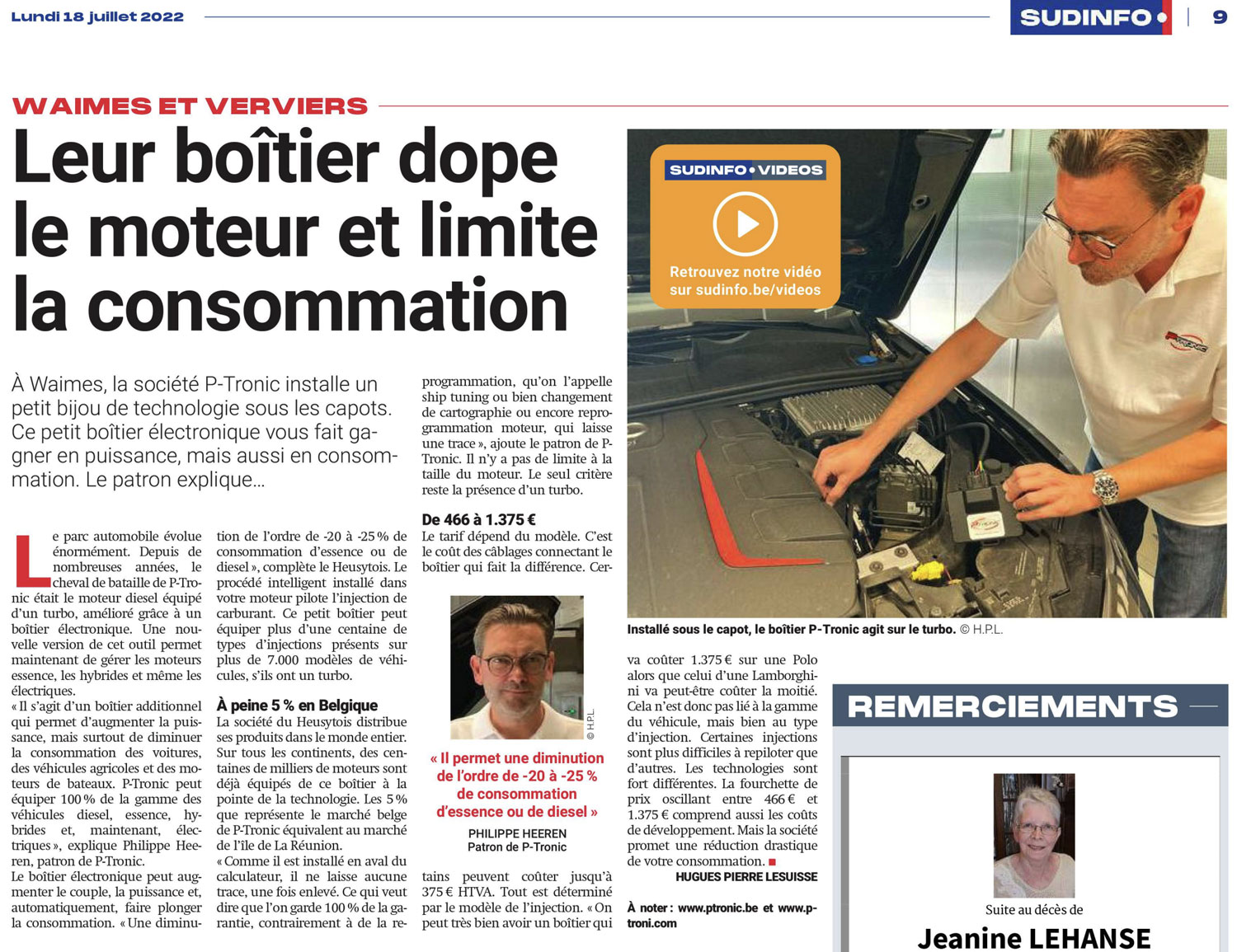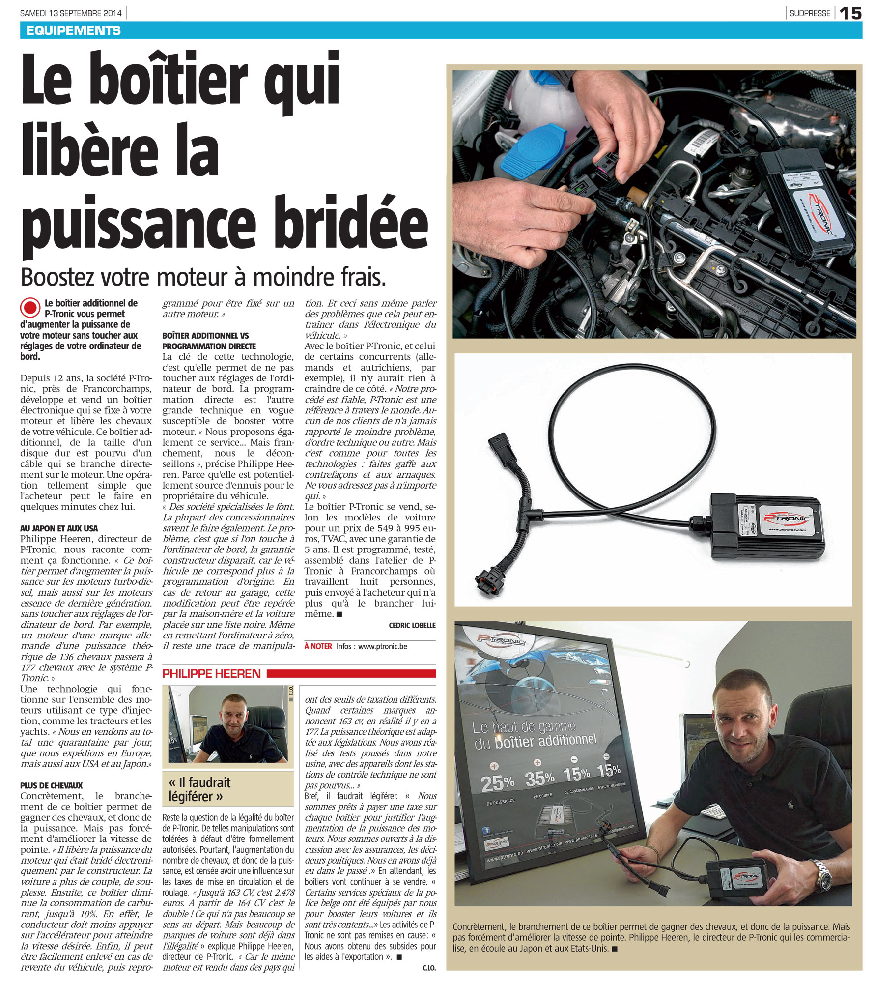 Sudpresse wijdt een reportage aan P-Tronic, KMO van een tiental personen die wereldleider is geworden in powerboxen. Het bedrijf exporteert naar meer dan 60 landen met distributeurs in Frankrijk, Italië en Denemarken.